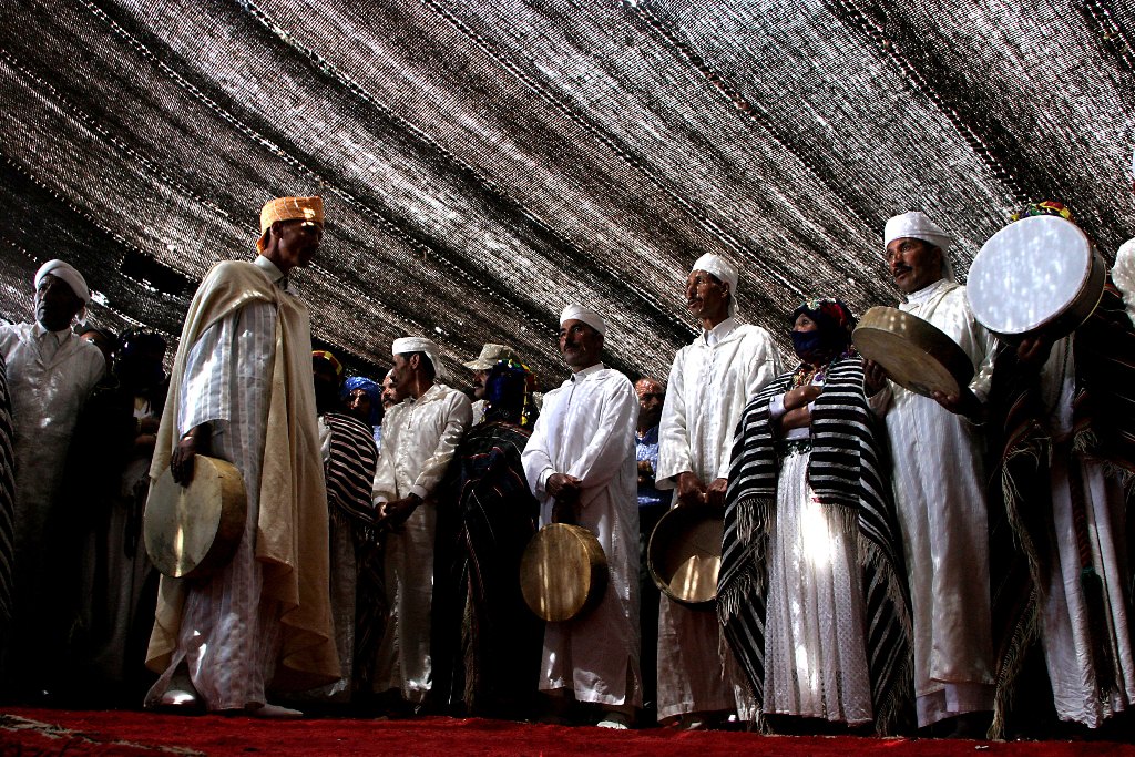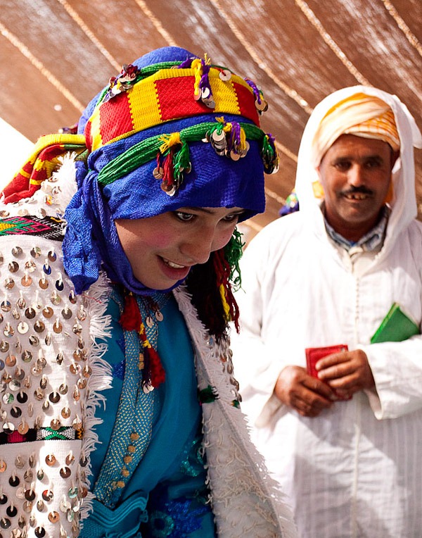 “Durante os dias do Moussem, as mulheres casadoiras apresentam-se com as suas melhores roupas, o rosto decorado, e cobertas com uma capa de lã tradicional com riscas brancas e negras, ou negras com riscas finas de cores, chamada “ahendir”. As viúvas e divorciadas, denominadas “timdoual”, anunciam a sua condição com um toucado terminado em forma cónica, enquanto as raparigas virgens, as “tirbatine”, usam um toucado plano. Os aspirantes a noivos, por seu lado, vestem elegantes trajes imaculados, brancos ou de cores claras, e cobrem a cabeça com um turbante igualmente branco.”