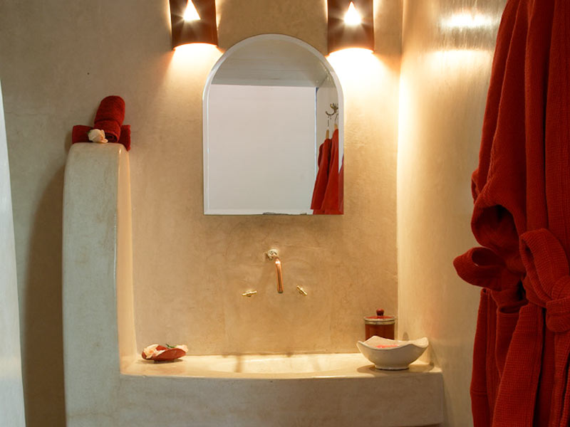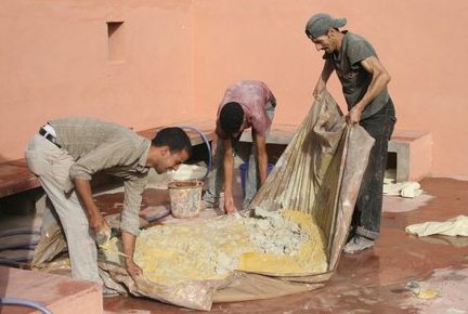 Chama-se Tadelakt, designação que provém do Árabe “dlak”, que significa massajar ou amassar, dado que é uma argamassa tem de ser “apertada” para lhe ser retirado todo o ar existente no seu interior. O tadelakt é um reboco à base de cal da planície do Haouz, que utiliza o pó de mármore ou a areia fina como inerte, pigmentado, apertado à talocha, barrado com sabão diluído em água, polido com um seixo e, opcionalmente, finalizado com uma camada de cera.