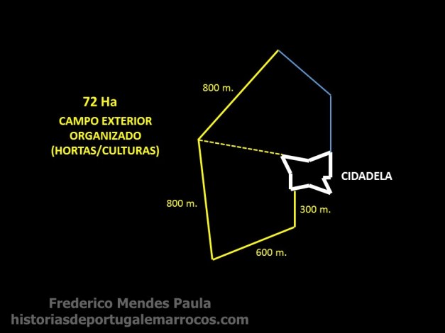 “Sou informado que, de alguns anos a esta parte, junto aos muros da Vila de Mazagão, e no contorno dela, assim dentro dos revelins, como fora deles, se fizeram e plantaram muitas quintas e hortas, cercadas de valados e paredes altas e taipa e de pedra e barro, e pedra e cal; dentro das quais quintas e hortas, os mouros, quando correm àquela fortaleza, se recolhem e amparam, ficando seguros, para se avizinharem mais ao muro. Mandava o Rei, pelos seus oficiais, que se derrubassem todas as hortas e quintas, para que se deixassem os revelins cumprir a sua missão de defesa.” (FARINHA, 1970, p. 50-51)