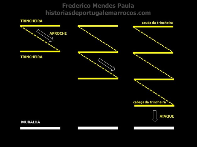 A táctica de cerco de Sidi Mohamed tem por base a abertura de valas em ziguezague, conhecidas por aproches (do inglês approach, aproximar), sendo as trincheiras colocadas em posição frontal à muralha, para fogo de artilharia, e os aproches em posição diagonal, para avanço no terreno, ligando duas trincheiras entre si.