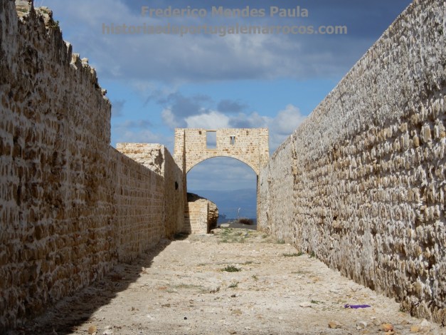 O dito corredor era coberto com um telhado, com caminho de ronda em toda a sua extensão de um lado e do outro, provido de merlões, tendo na sua extremidade dois torreões circulares ou baluartes guarnecidos de bocas de fogo e uma porta de grandes dimensões. O Baluarte Oeste tinha no seu nível superior “duas bombardeiras dirigidas a Oeste, em direcção a uma montanha próxima chamada Seinal e uma para o mar. Na torre (Este) haviam outras duas dirigidas ao campo e outra para o mar.” (GOZALBES CRAVIOTO, 1977, p. 52)