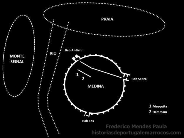 O local era densamente ocupado por construções, ruas e praças, tendo como eixo estruturador a Rua Direita, ligando a Porta de Ceuta à Porta de Vila, e como edifícios principais a Igreja de santa Maria da Misericórdia, antiga Mesquita, a Assembleia da Vila, a Prisão, adaptada do Hammam, ou Banhos Públicos e a Igreja de S. Sebastião, havendo também evidências da existência de um mercado. (REDMAN e BOONE, 1979, p. 13-14)