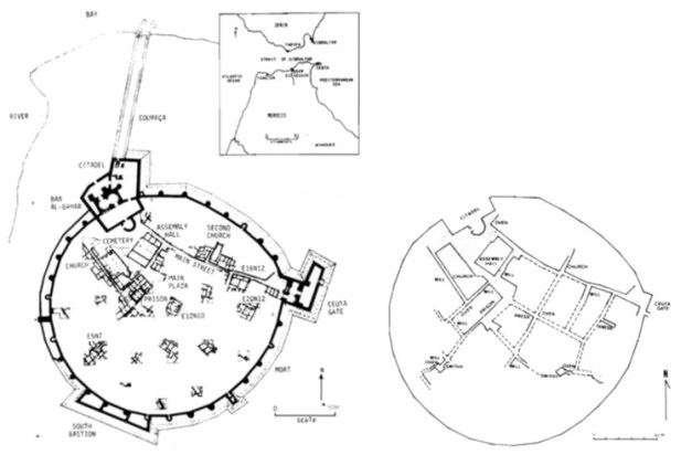 Referem Charles Redman e James Boone, arqueólogos americanos que escavaram inicialmente o local nos anos 70, que no período da ocupação portuguesa “a colónia tornou-se mais do que um posto avançado militar, evoluindo para uma cidade altamente diferenciada com ruas calcetadas, várias praças, grandes edifícios públicos e uma variedade de estruturas particulares, públicas e religiosas”. (REDMAN e BOONE, 1979, p. 5)
