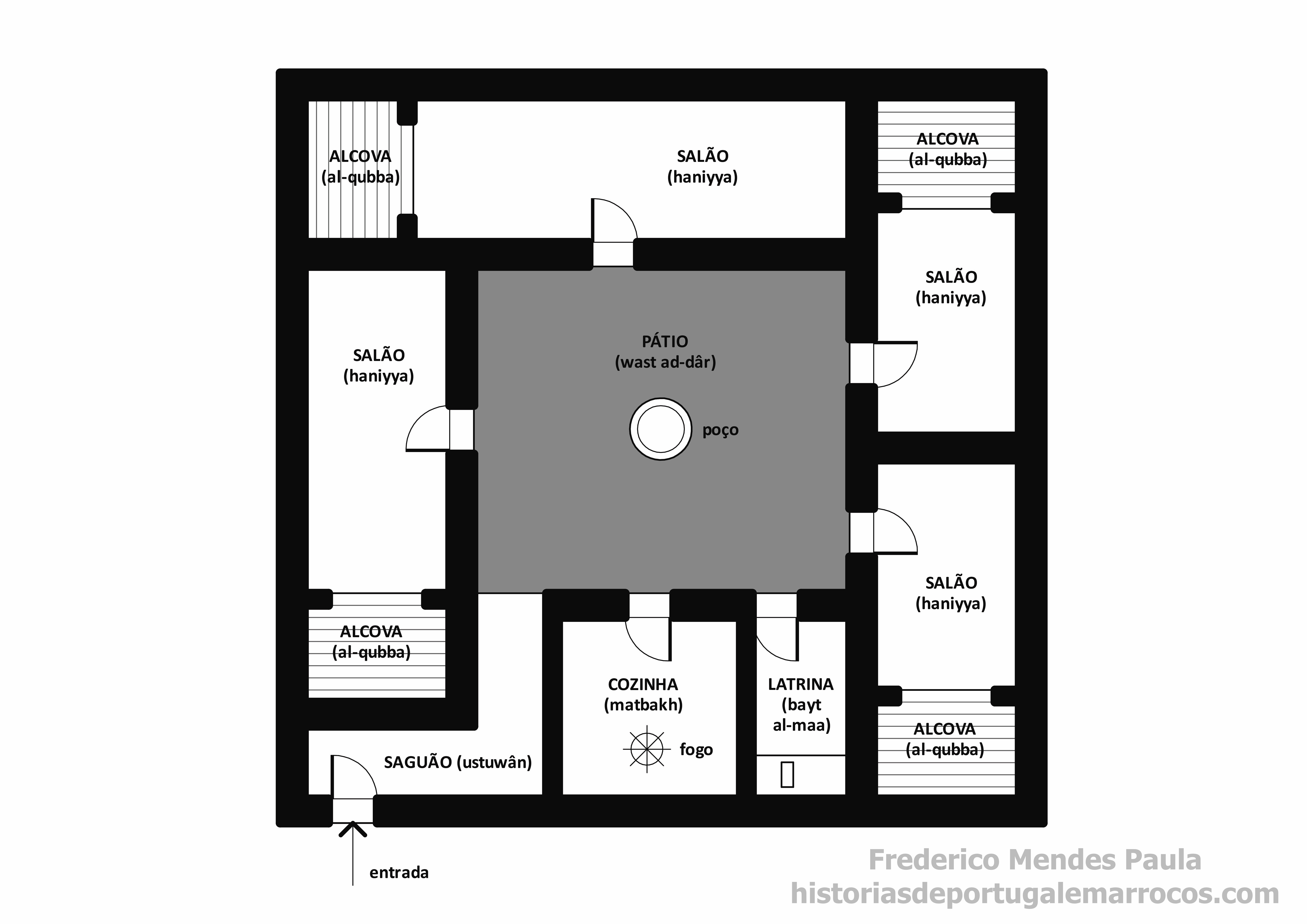 Voltada para o interior, com uma ligação mínima ao espaço público, tinha no pátio e na açoteia os seus elementos de contacto com o exterior, protegidos das vistas dos vizinhos. A casa-pátio era a tipologia de habitação partilhada por famílias muçulmanas, cristãs ou judias (BAZZANA, 2011: 52).
