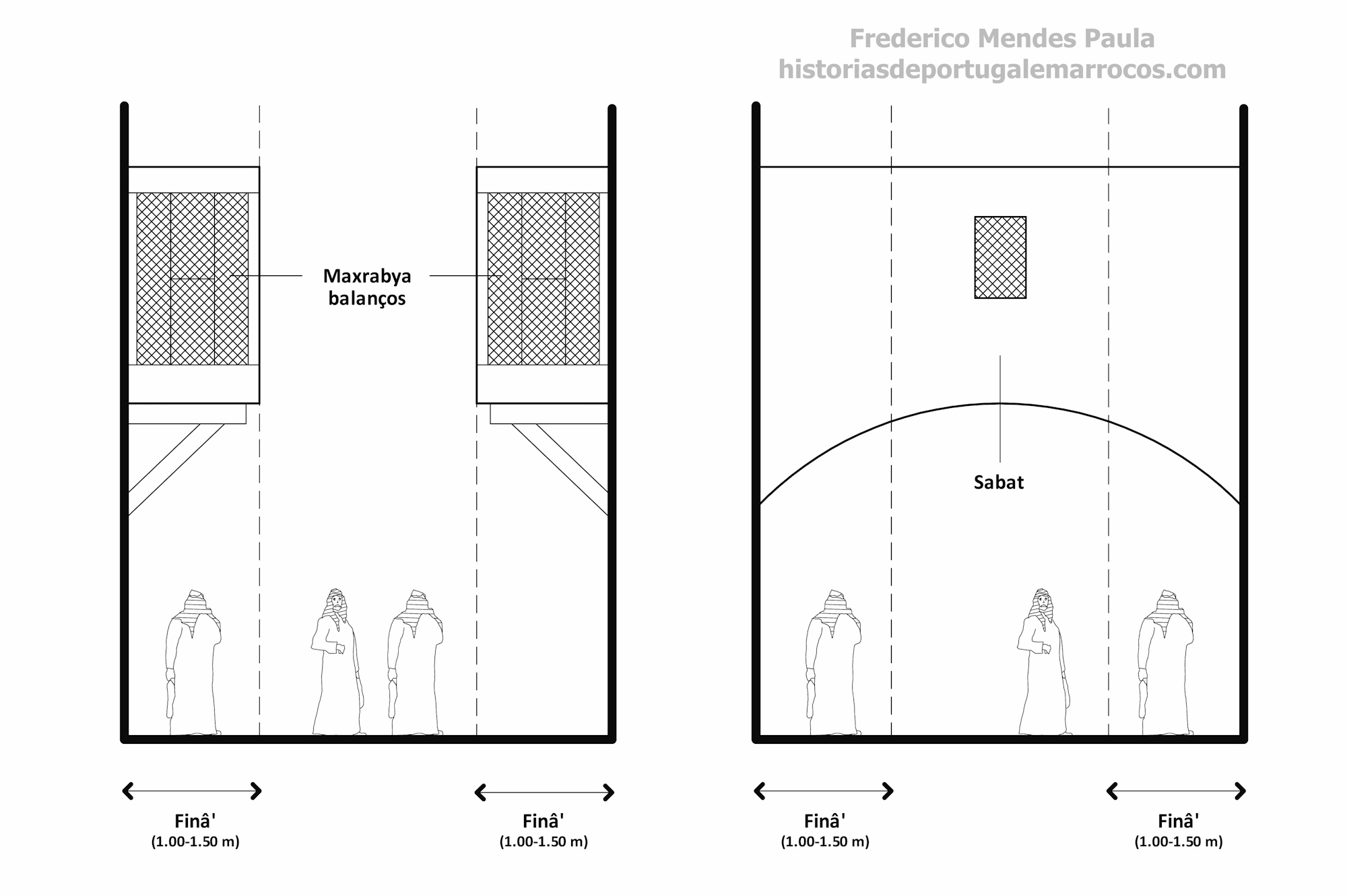 A casa tinha três espaços especializados: o saguão, a cozinha e a latrina. A restante habitação era dominada pelos salões, ou haniyya (Haniyya significa arco ou abóbada), de forma retangular, que funcionavam também como quartos, constituindo aquilo a que podemos chamar o espírito nómada no sedentarismo, ou seja, a utilização dos vários compartimentos em função das épocas do ano e das horas do dia, conforme as suas características de temperatura ou humidade. Nos extremos dos salões situavam-se as alcovas, al qubba (Qubba significa cúpula), pequenas zonas de dormir separadas da zona de estar por um arco e com o pavimento elevado, constituído por um sobrado de madeira, a tarîma, sob o qual se armazenavam objetos da casa, mas que tinha uma função importante no conforto da cama, por evitar as humidades do solo e o frio (PÉREZ ORDÓÑEZ, 2008: 35).