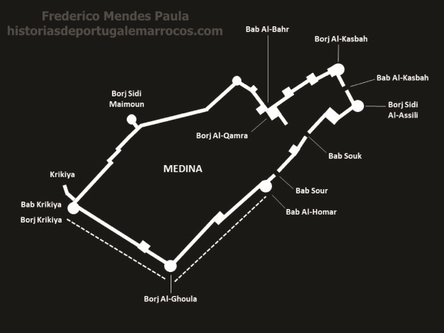 Representação da Arzila portuguesa após a construção do Atalho, de acordo com os elementos de José Carlos Babiano Alvarez de los Corrales, Martina Lagos Mariñansky e Federico Garcia Martinez