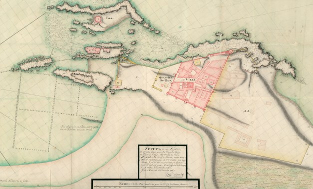 PLAN DE LA GRANDE ISLE DE MOGODOR Et de ses Environs, Remply des Ecueils, de la Rade, du chateau et de la nouvelle ville Suera en Barbarie, a trente Lieues du Maroc : Dedié a Monseigneur, le duc de Choiseul, Ministre de la guerre, Et Secretaire d’Etat, pour donner a son Exellence, une connaissance parfeite de cette place, Et de l’humeur de ses barbares / Par le Sieur Theodore Cournut, ancien dessinateur de fortifications des places du Roussillon. Fait à cette le 25 octobre 1767. [signé :] Cornut 1767, Bibliothèque Nationale de France