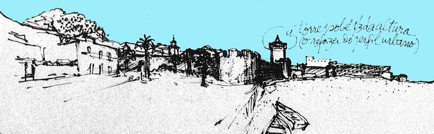 Desenho realizado pelo arquitecto João Campos aquando da condução das obras de recuperação da Torre de Menagem de Arzila, fazendo uma previsão do seu impacto na imagem do “skyline” da cidade (CAMPOS, 1995, obra citada)