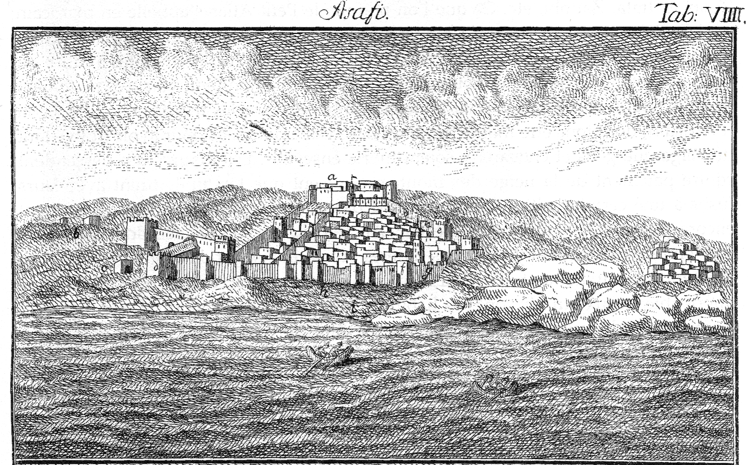 Gravura de Safi da autoria de Peter Haas, incluída na obra Efterretninger om Marokos og Fes [1779] de Georg Horst, Conselheiro de Justiça de Sua Majestade Real da Dinamarca e Vice-cônsul dinamarquês em Mogador, publicada por N. Moller, Copenhaga, reeditada na obra Relations sur les Royaumes de Marrakech et Fès, recueilles dans ces pays de 1760 à 1768, (2002) Éditions La Porte, Rabat