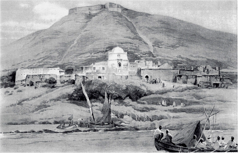 Gravura de Agadir de 1779, de Peter Haas, incluída na obra Efterretninger om Marokos og Fes [1779] de Georg Horst, Conselheiro de Justiça de Sua Majestade Real da Dinamarca e Vice-cônsul dinamarquês em Mogador, publicada por N. Moller, Copenhaga, reeditada na obra Relations sur les Royaumes de Marrakech et Fès, recueilles dans ces pays de 1760 à 1768, (2002) Éditions La Porte, Rabat