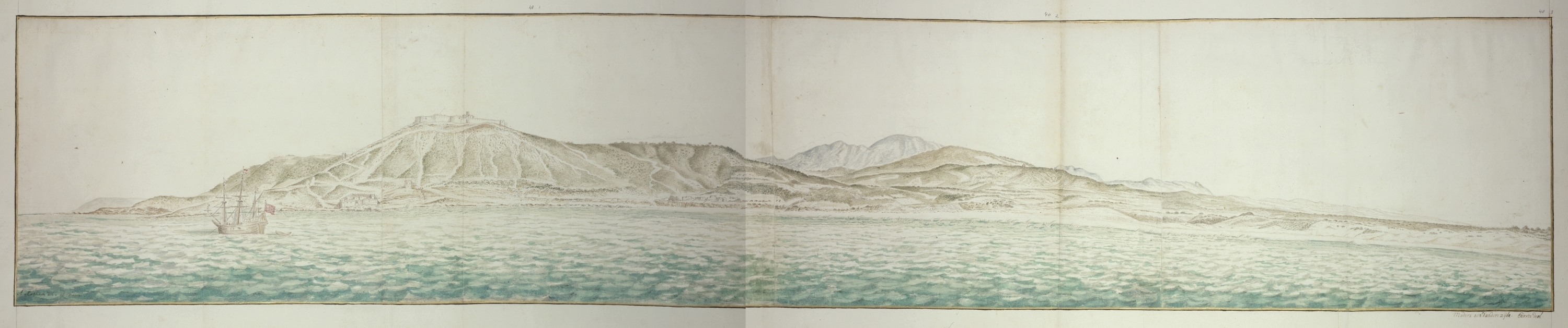 Gravura de Santa Cruz da Berbéria de 1790 (?), de Martinus Lambrechts, Museu Marítimo Nacional de Amesterdão. Aanzicht van de stad en haven Agadir in Marokko, Lambrechts, Martinus, 1790(?), Afbeelding van St. Cruz in Barbareyen, Nederlands Scheepvaarmuseum Amsterdam