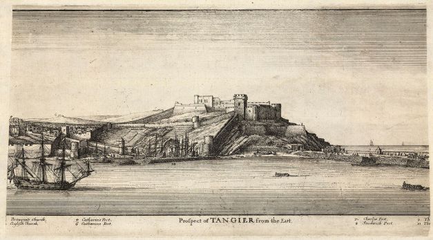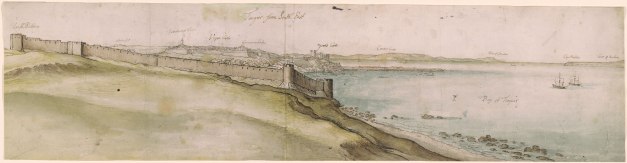 Tangier from the Sea; view looking S over the water towards the city and fortifications, including York Castle, the Upper Castle and Governor’s House, and Peterborough Tower, on the left, the mole jutting out into the sea, and on the extreme r, the settlement of Whitby with Charles Fort on the hill above it, Wenceslaus Hollar, 1669, The British Museum