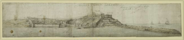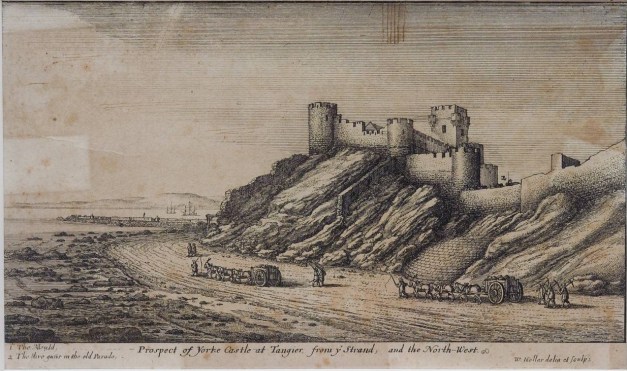 Tangier from the sea; view looking S towards the city and fortifications, including York Castle, the Upper Castle and Governor’s House, and Peterborough Tower, on the left the mole jutting out into the sea, on the extreme right the settlement of Whitby with Charles Fort on the hill above it, in the foreground an English two-decker on the left and a ketch on the right, flying the red ensign, Wenceslaus Hollar, 1669, The British Museum